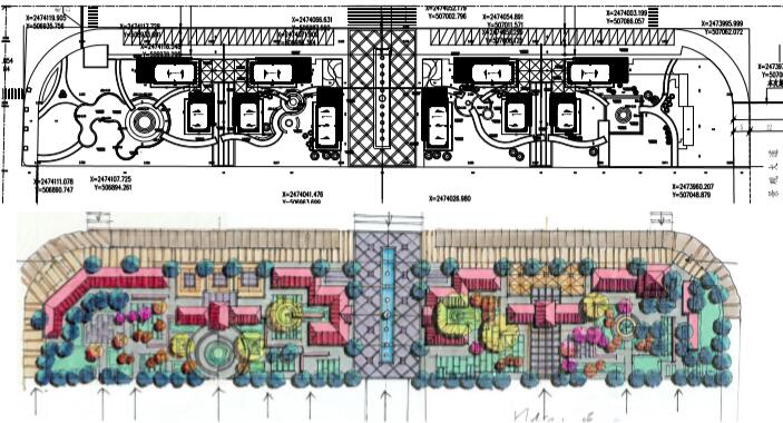 在設(shè)計地塊中心是一長條形的旱噴景觀,是游園主要的景觀節(jié)點,達(dá)到吸引人群,增強空間氛圍,是休閑市民進(jìn)入商場的主要廊道。 地塊兩側(cè)分別設(shè)置三五處活動節(jié)點,為前來游園的人提供開放、半私密、及私密空間,功能上有商業(yè)空間、 休閑空間、娛樂空間等,用自由的曲線道路把各個景觀節(jié)點有效得聯(lián)系起來。