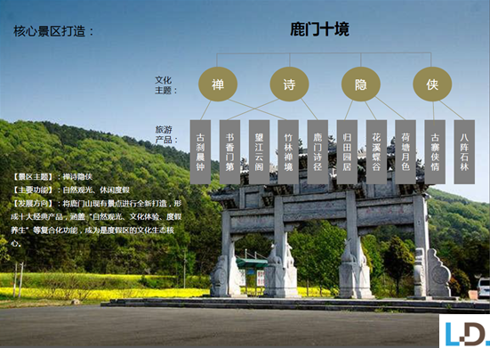 策劃思路:項目以隱逸文化為主題打造“鹿門十景”,形成景區旅游吸引力,二次激活鹿門山大眾旅游;開展“慢游鹿門”工程以休閑綠道建設,滿足專項市場需求,樹立景區形象;做大鹿門寺宗教旅游打造襄陽宗教旅游第一品牌;全面強化景區基礎設施建設,優化景區旅游環境,打造 AAAA 級旅游景區。